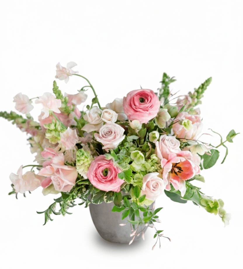 A romantic & airy arrangement of sweet pea, pink ranunculus, pale pink roses, snap dragons, and soft green hydrangea surrounded by a variety of delicate seasonal blooms and greenery for an effortless gentle feel. This arrangement will feature a ceramic vase. Perfect for celebrations, as a pick me up, or just to say I’m thinking of you!